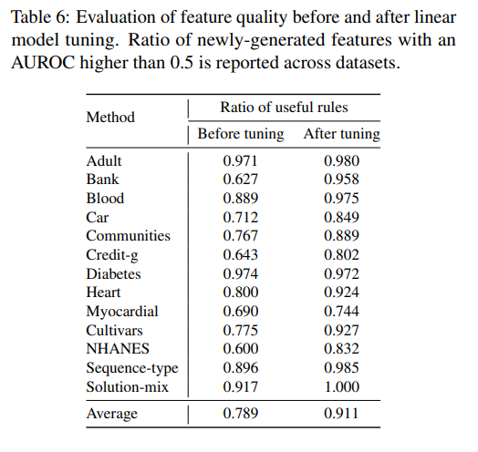 따라서 FeatLLM이 생성한 규칙에 기반한 피쳐가 대부분 유용하며, 선형 모델의 필터링 과정을 통해 불필요한 규칙들을 탈락시킬 수 있음을 보였습니다.