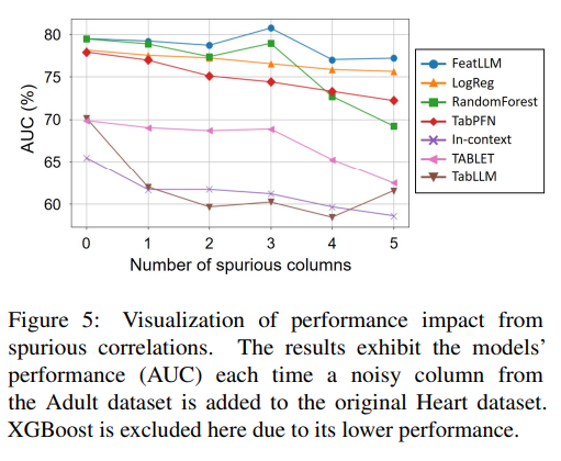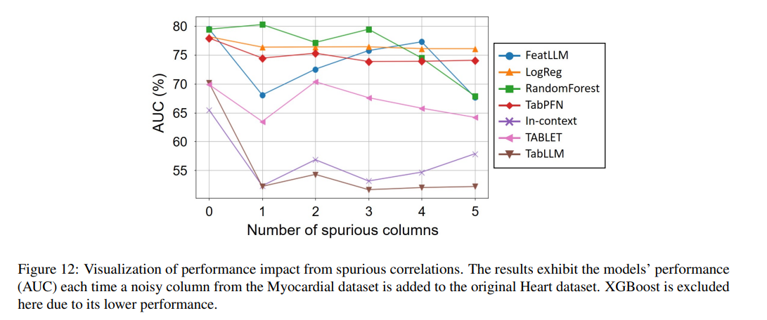하지만 FeatLLM이 관련이 있는 데이터에서 임의로 컬럼을 추가할 경우, 거짓 상관 관계와 인과 관계를 학습할 수 있다는 점 또한 관측되었습니다. Figure.12는 APPENDIX I에 있는 결과로, Heart 데이터셋에 Myocardial 데이터셋의 컬럼을 추가한 실험 결과입니다. 결과적으로 FeatLLM은 노이즈 정보에 대한 규칙을 더 많이 추출하여 과적합되고, 이로인해 노이즈가 포함된 컬럼으로부터 추출된 규칙이 전체의 7-8%를 차지하였습니다. 다른 모델에서도 성능이 유의미하게 감소하는 결과를 확인할 수 있었습니다.