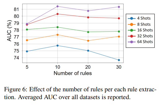 실험 결과, 앙상블의 수가 증가함에 따라 성능이 향상되었지만, 일정 수치(20)을 넘으면 성능 향상이 수렴함을 보였습니다. 이는 규칙이 많아지면 입력 차원이 커져, 정보는 증가하지만 low-shot 환경에서는 과적합이 발생할 수 있음을 의미합니다.