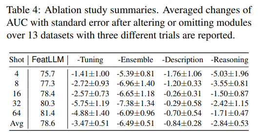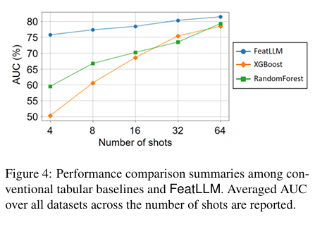 FeatLLM은 다른 베이스라인 모델들과 비교했을 때, 대부분의 경우에서 가장 좋거나 혹은 2번재로 좋은 성능을 달성하였습니다. 특히, 4개의 shot만으로도 32개의 shot으로 학습한 전통적인 머신러닝 모델과 비슷한 성능을 달성합니다.(figure.4 참조)