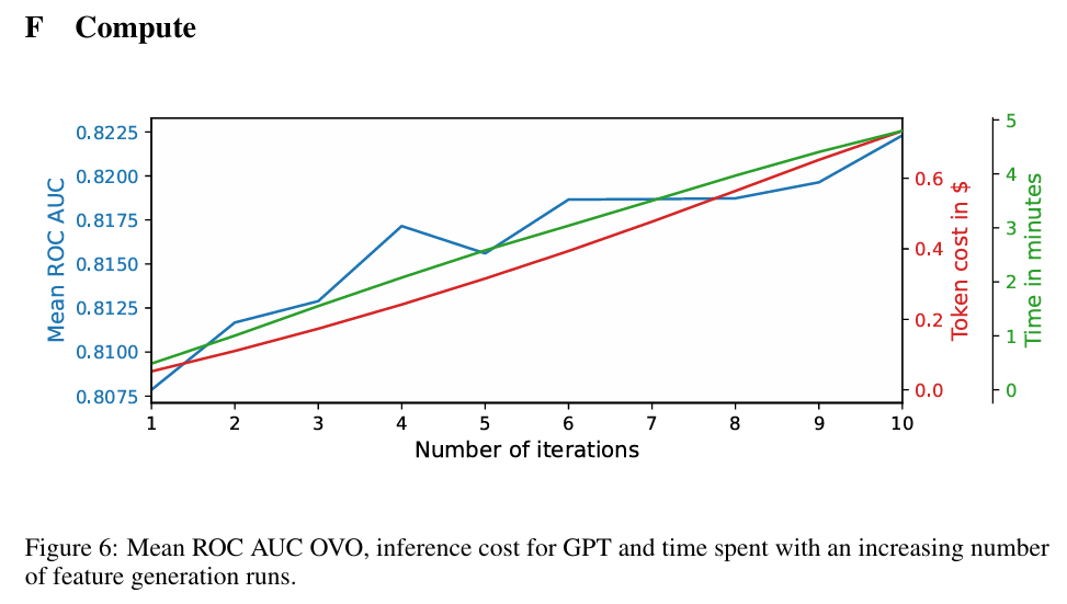 Figure.6을 통해 특성을 생성하는 반복 횟수에 따라 유의미하게 성능이 올라가지만, Token에 대한 비용과 소요 시간이 함께 증가하는 것을 알 수 있습니다.