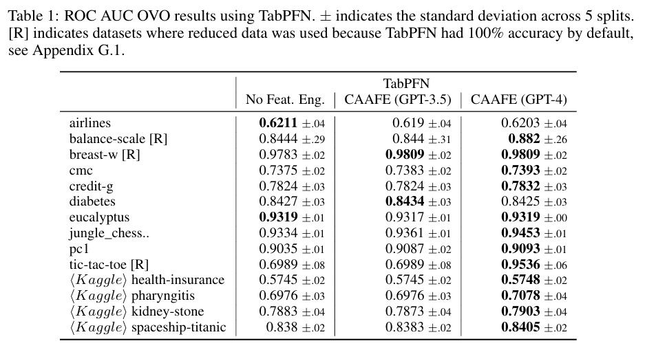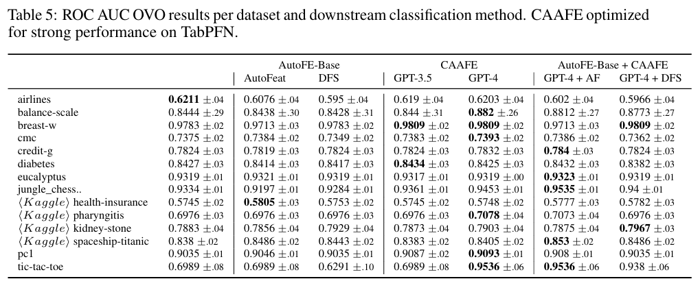 CAAFE는 TabPFN의 성능을 상당히 개선할 수 있었습니다. 특히, GPT-4와 결합하게 되면 평균 ROC AUC 성능을 0.798에서 0.822로 개선시킬 수 있으며 이는 14개의 데이터셋 중 11개의 데이터셋에서 성능이 향상된 결과입니다.