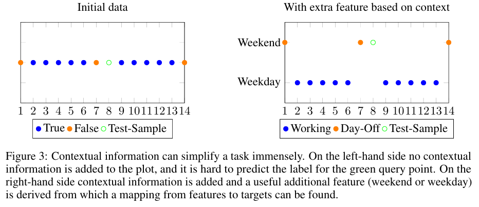 Figure.3은 문맥 정보의 유용성을 보여줍니다. 왼쪽은 문맥적인 정보가 존재하지 않아 초록색 포인트를 예측하기 어렵지만, 오른쪽은 주말과 평일에 대한 문맥의 정보가 제공되어 예측이 훨씬 용이해집니다.
