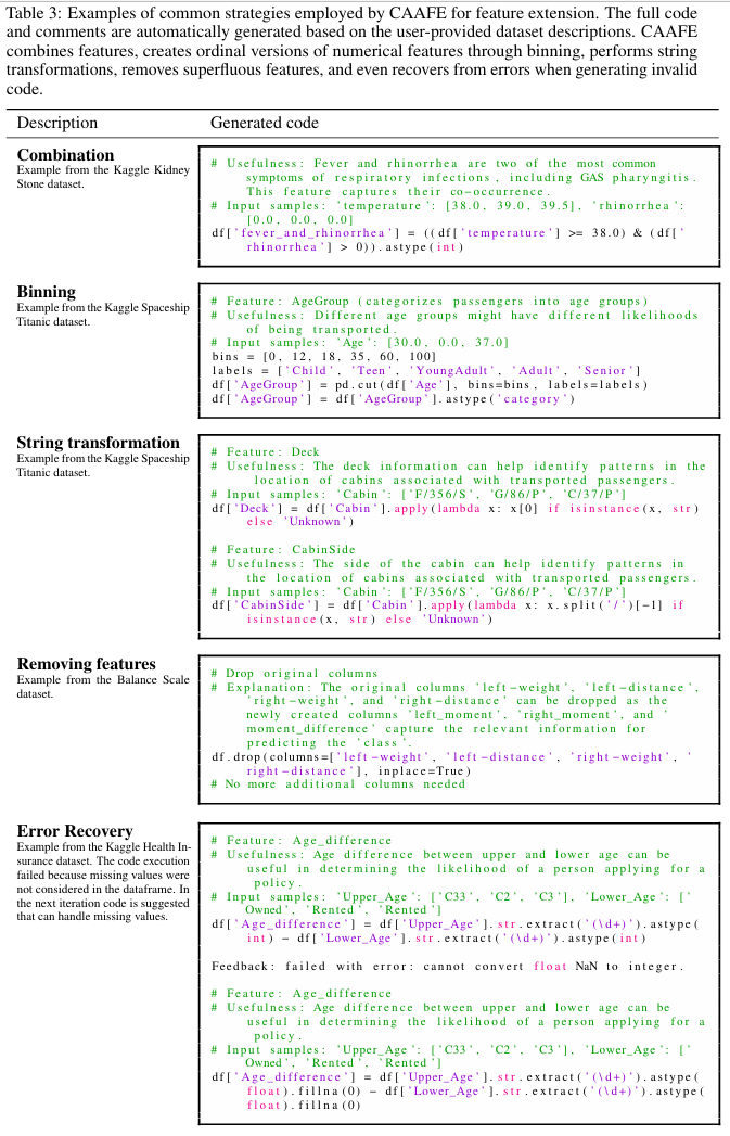 CAAFE는 주로 1) 특성을 결합하거나, 2)수치형 특성을 범주(구간)화하여 서열 데이터를 생성하거나, 3) 문자열을 변환하거나, 4) 불필요한 특성을 제거하거나, 5) 잘못 생성된 코드의 오류를 복구하는 방법으로 피처 엔지니어링을 수행합니다.