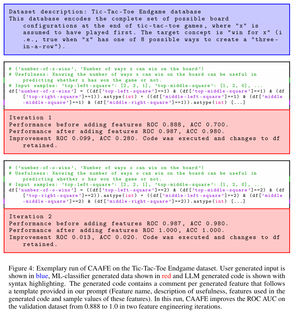 CAAFE는 새로운 피처를 생성하는 Python 코드를 제공하며, 해당 코드의 유용성에 대한 설명도 제시합니다. 비록 방법론적으로는 단순하나, 14개의 Dataset중 11개에서 성능을 향상시켯으며 평균 ROC AUC 성능을 0.798에서 0.822로 증가시켰습니다.