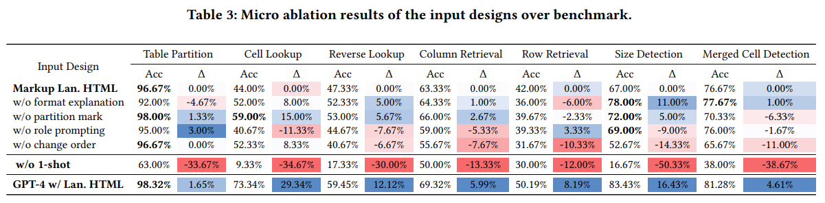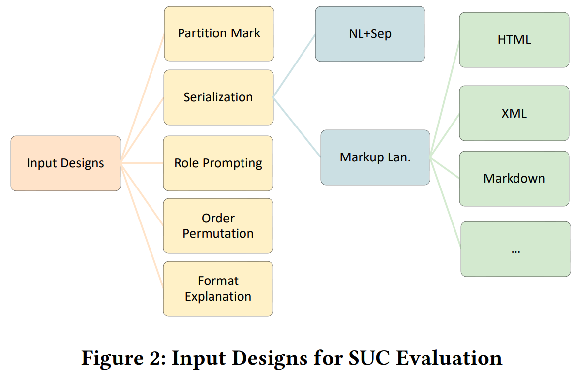 일반적으로는 Natural Language에 구분자(Sep)을 추가하는 방식을 사용하지만, 실험 결과 HTML을 중심으로 한 Markup 언어 방식이 NL+Sep방식보다 평균적으로 높은 성능을 얻었다. 이는 LLM이 학습을 하는 과정에 code tuning이 포함되어있으며, 학습 데이터셋에 web table data가 상당히 포함되어있기 때문으로 보인다.