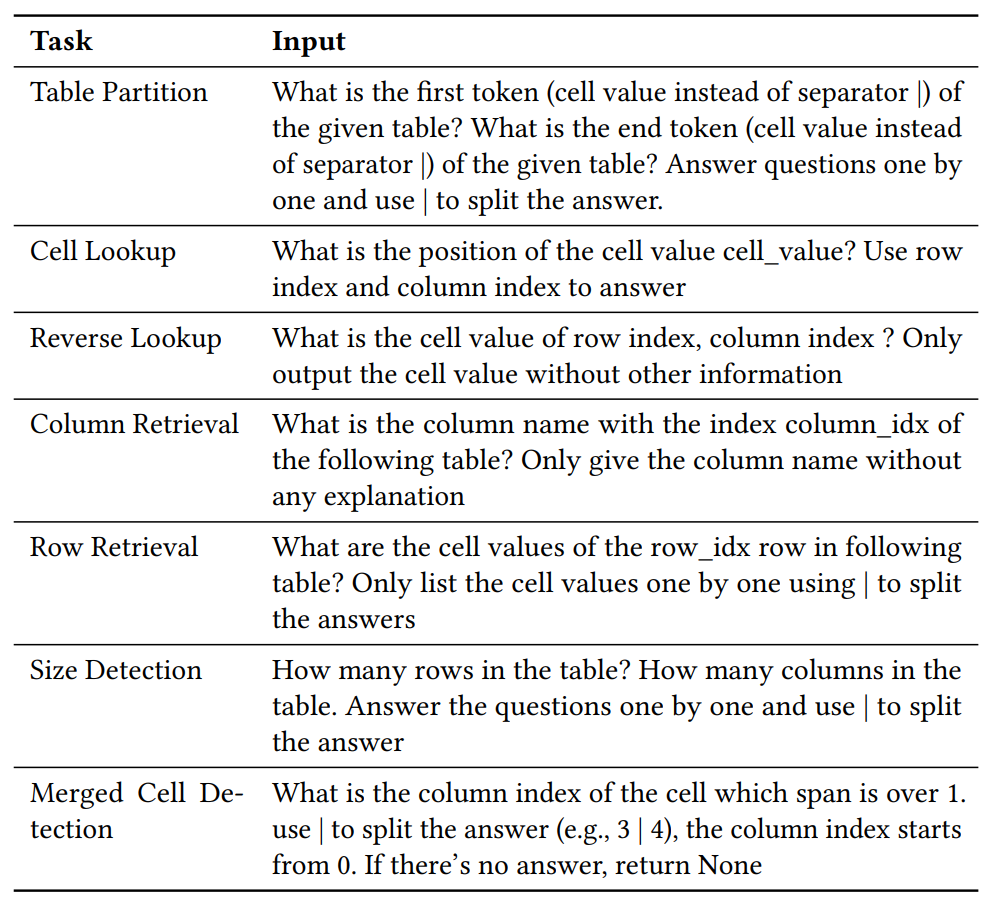 LLM은 다양한 table task를 수행하기 이전에 표의 경계를 파악하고 레이아웃을 이해하며, 구조를 분석하는 능력이 선행되어야한다. 또한, CSV, JSON, XML 등 다양한 형식의 테이블이 존재하며 이들은 정보 압축의 정도와 구조가 다르기에 이러한 형식을 이해하고 파싱하는 능력(Partition & Parsing)이 필요하다.