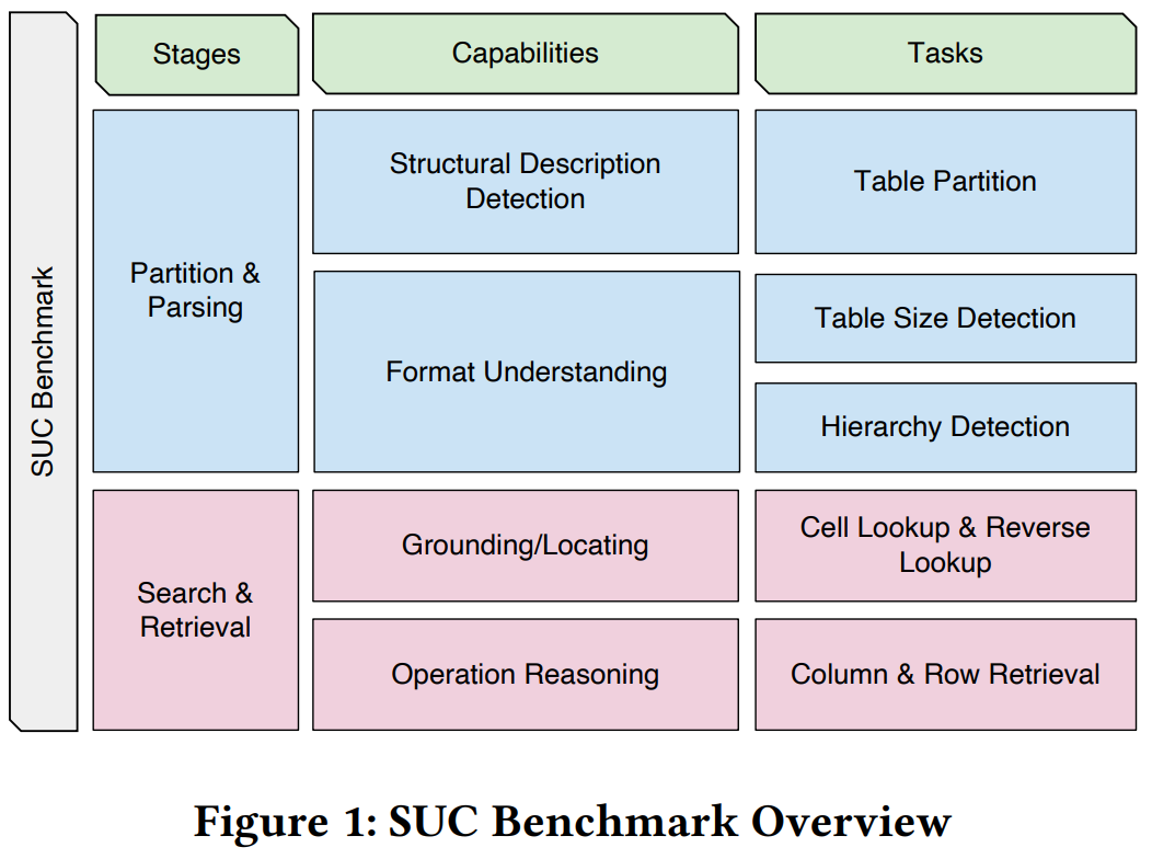 이에 따라 해당 논문에서는 구조적 이해 능력(SUC, Structural Understanding Capabilities)를 평가하기 위한 벤치마크를 설계하고, LLM의 테이블 이해 능력을 규명하고자 한다. 벤치마크는 cell lookup, row retrieval, size detection 등 다양한 테스크를 포함한 7개의 과제로 구성되어있다.