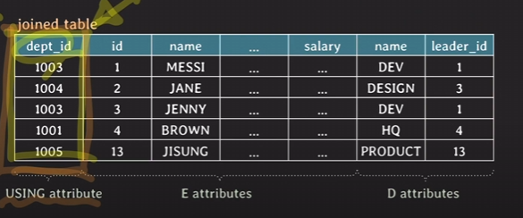 USING을 쓰게 되면 합쳐진 attribute는 맨앞쪽으로 위치하게 된다.
