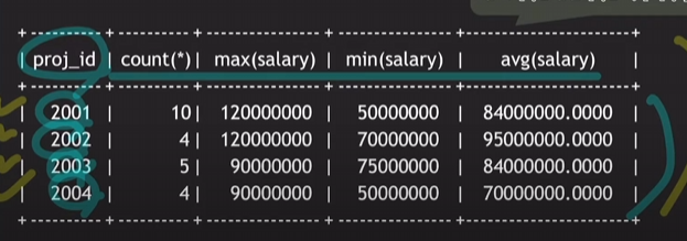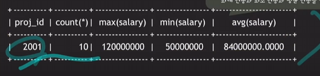 proj_id별 임직원 수와 최대연봉과 최소연봉과 평균연봉