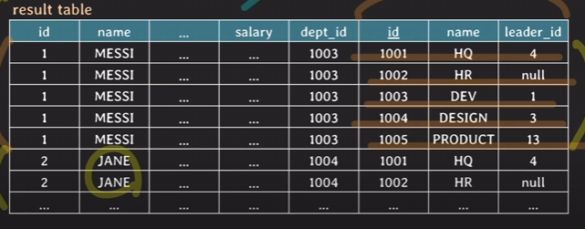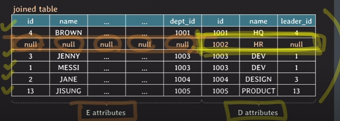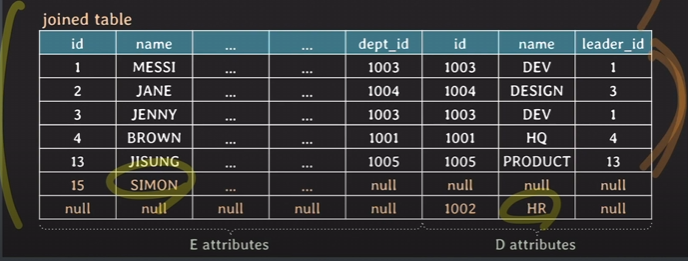 일 때 E 테이블에서 null값을 가지고 있는 사원은 포함되어 null값을 나타내는 result table이 됨.