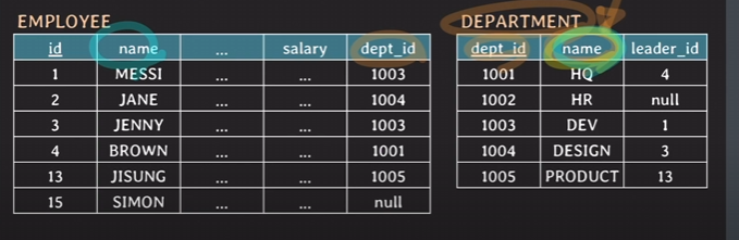 위에서 사용한 쿼리들 중에 =를 사용한 쿼리들은 모두 equi join이면서 각각의 이름을 가지고 있는 join들이다.