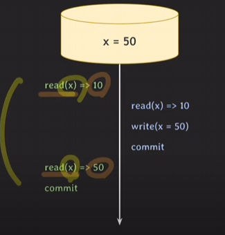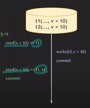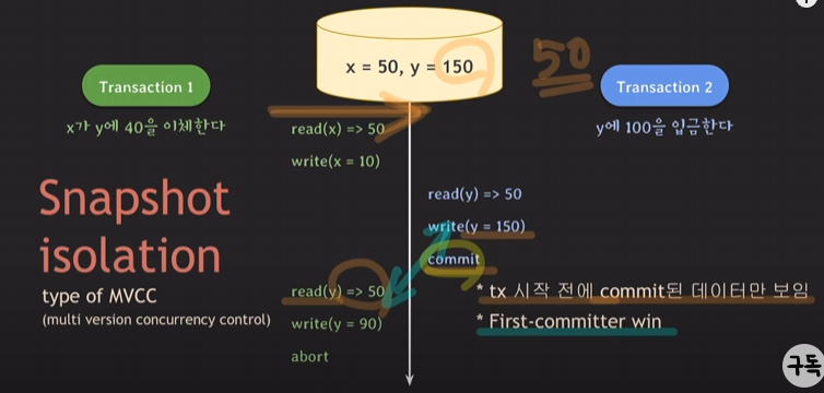 트랜잭션 시작 전에 commit된 데이터만 보이므로 트랜잭션1에서 read(y)를 실행해도 트랜잭션1이 화살표 시점에서 시작됐기 때문에 그 시점을 기준으로 y의 값을 가져옴. 그래서 트랜잭션2에서 commit된 150이 아닌 50을 읽게 됨.