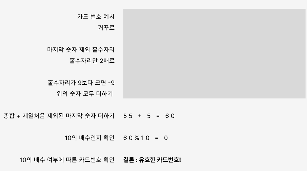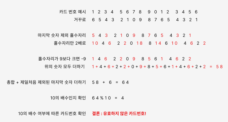 10. 총합 %10을 했을 때, 그 결과가 0이면 -> 유효한 카드번호 / 아닐경우 -> 유효하지 않은 카드번호