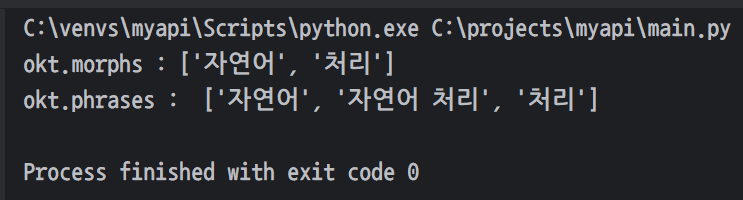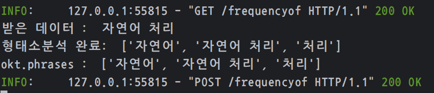 input 값으로 받은 텍스트를 Svelte -> FastAPI 를 거쳐서, py 파일에서 형태소 분석을 완료하여 다시 javascript 로 받아서 popup.html 에 보여주는것.