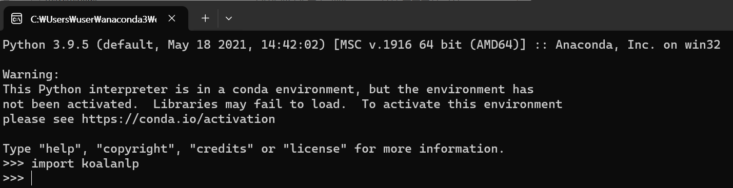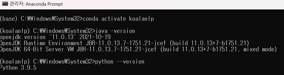 conda create -n koalanlp python=2.7.15 로 아나콘다 관리자 창으로 실행했다.