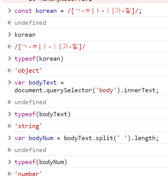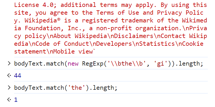 bodyText.match(new RegExp('\\bthe\\b', 'gi')).length;를 하면 너무나도 잘된다... (영어가 섞여있다는 조건 하에)