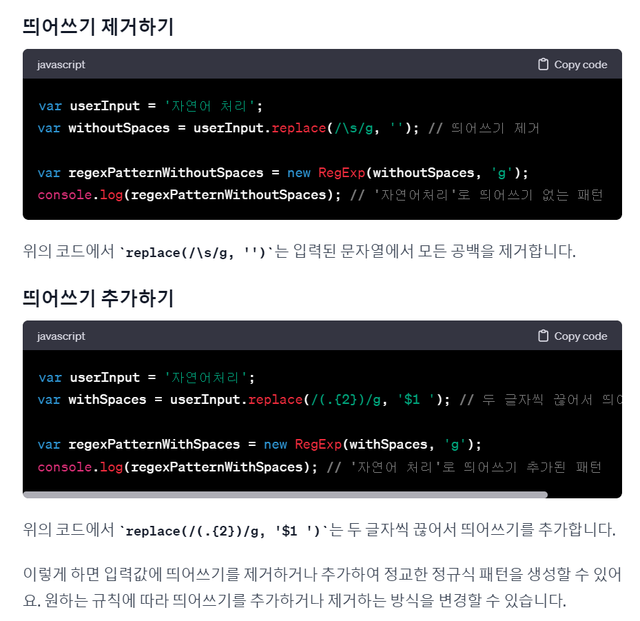 띄어쓰기를 감안하여 정규식패턴을 짜주는 함수가 필요할 듯 하다.