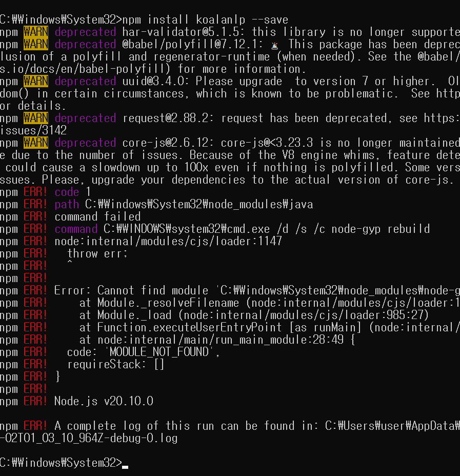 여기서도 npm install koalanlp --save 은 실패했다.