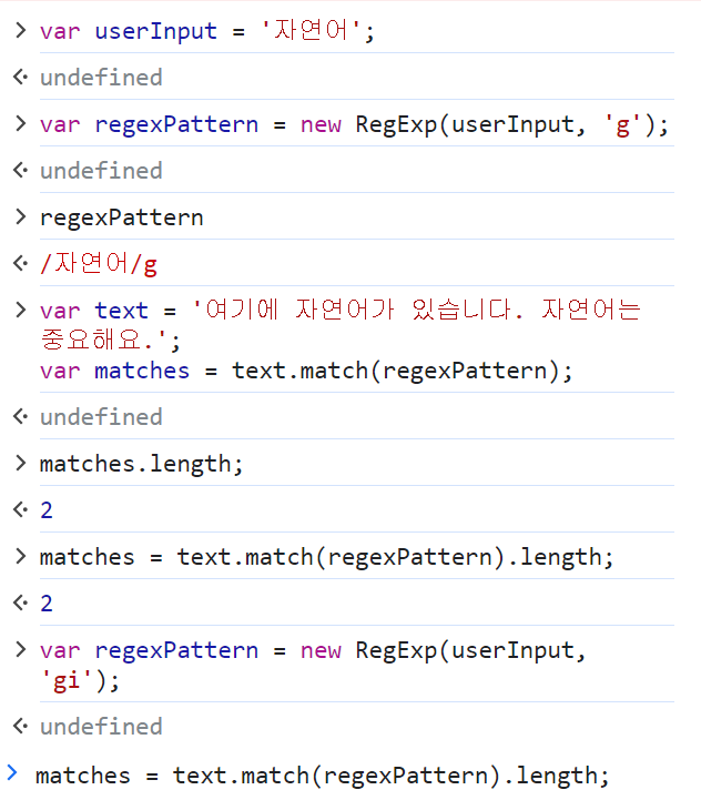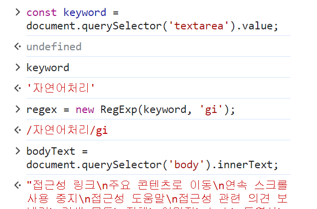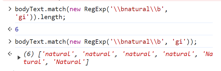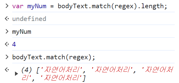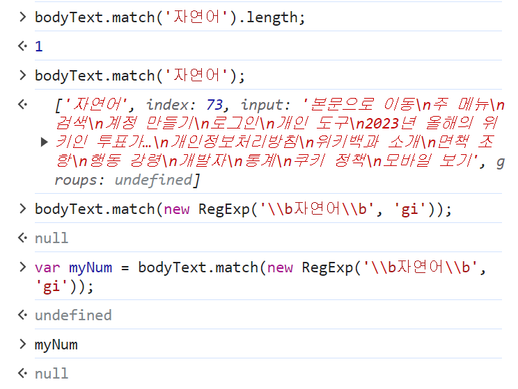 bodyText.match(new RegExp('\\b자연어\\b', 'gi')).length;null 뜸~ 🥹