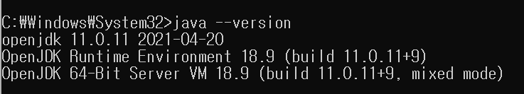 환경변수를 다시 체크해주고... 그제서야 java version 이 11.0.11 로 되어있다..