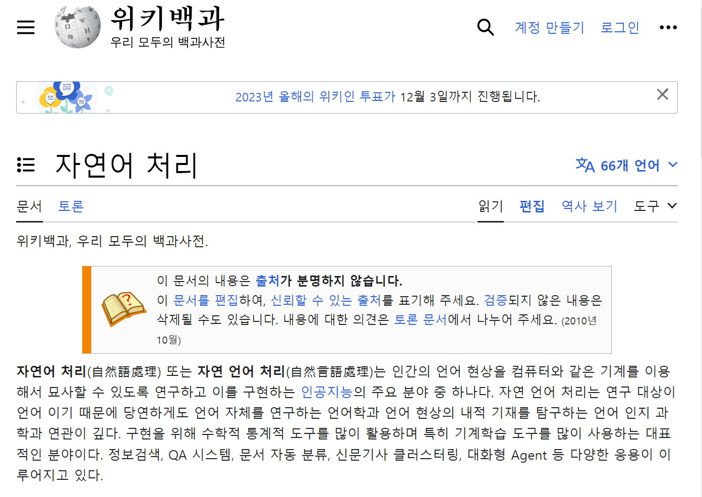 위키 백과의 자연어 처리 키워드를 검색한 페이지이다.