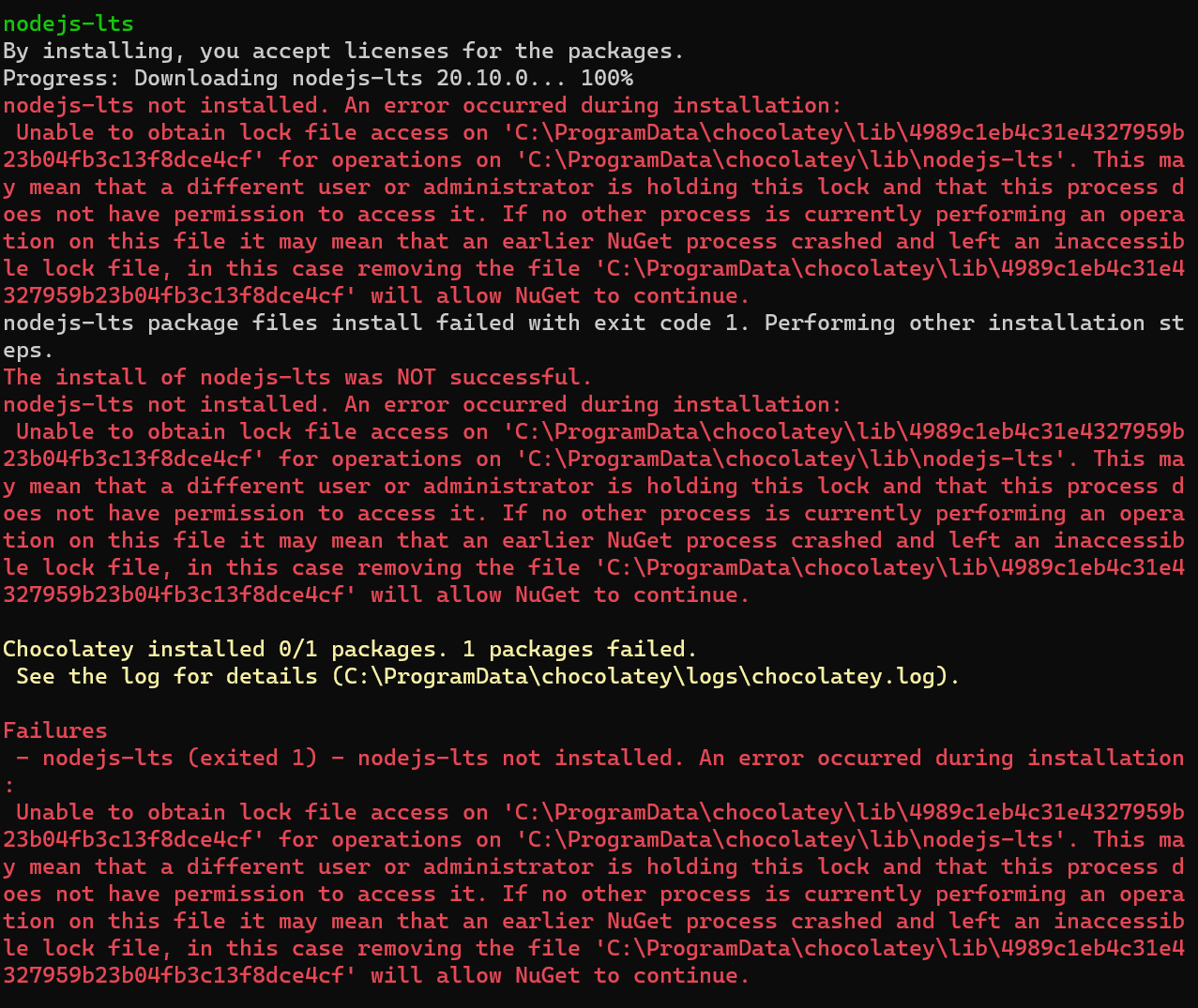 choco install nodejs-lts --version 20.10.0 -y 을 했는데, 아래와 같이 에러 코드가 떴다.This may mean that a different user or administrator is holding this lock and that this process does not have permission to access it.