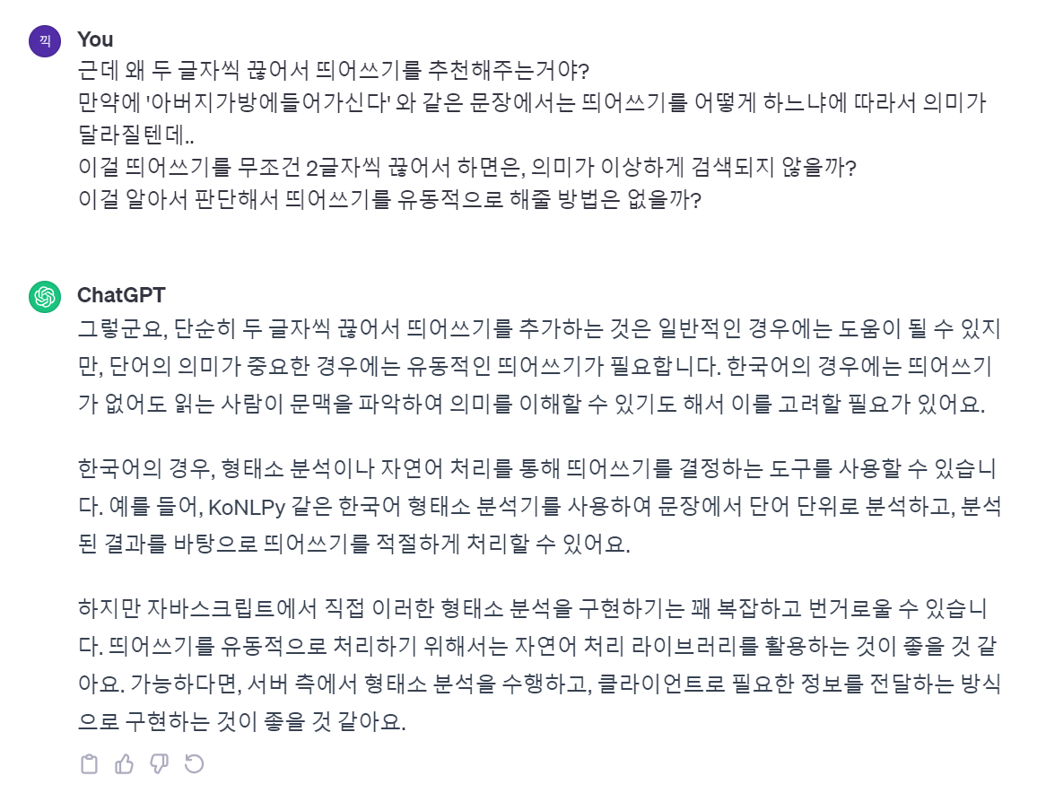 근데 이건 말도 안되는 해결책이다. 무조건 두 글자씩 끊어서 띄어쓰기를 한다고?