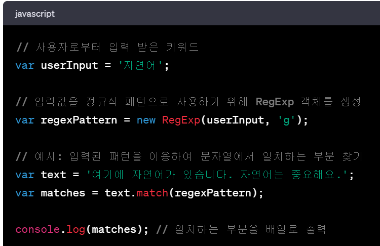 //정규식 객체를 생성하면서 위의 입력받은 keyword 변수를 넣고,