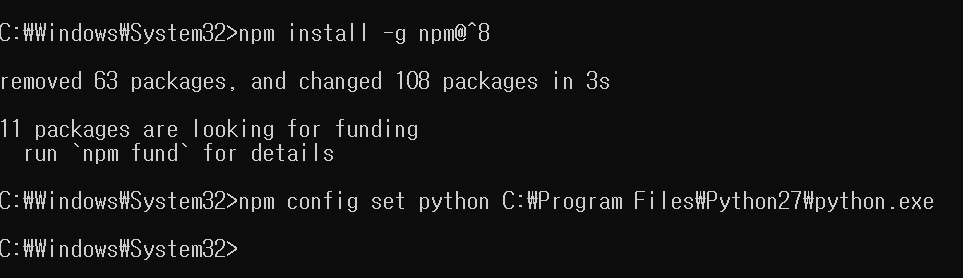 C:\Windows\System32>npm config set msvs_version 2019 도 성공했다..!