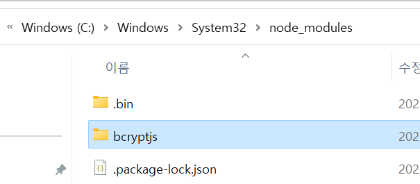 C:\Windows\System32>npm install --save bcryptjs 을 하면