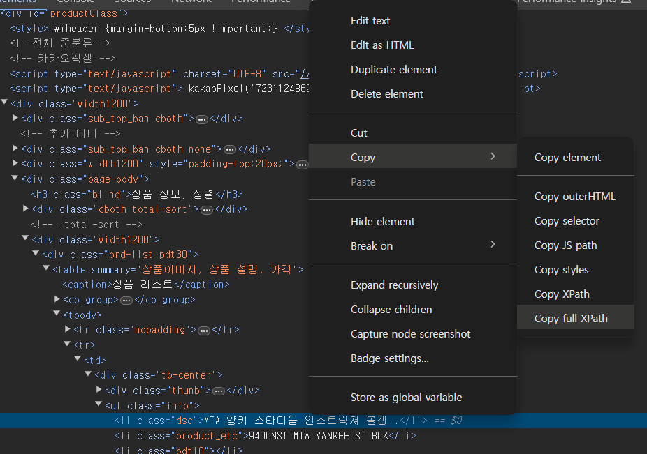 예제에서 모자의 이름이 있는걸 Selct 하고 오른쪽 클릭으로 Copy - Copy 하고 싶은 주소를 하면 된다.