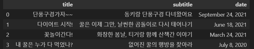 df = pd.DataFrame({'title': title_list, 'subtitle': subtitle_list, 'date': date_list})