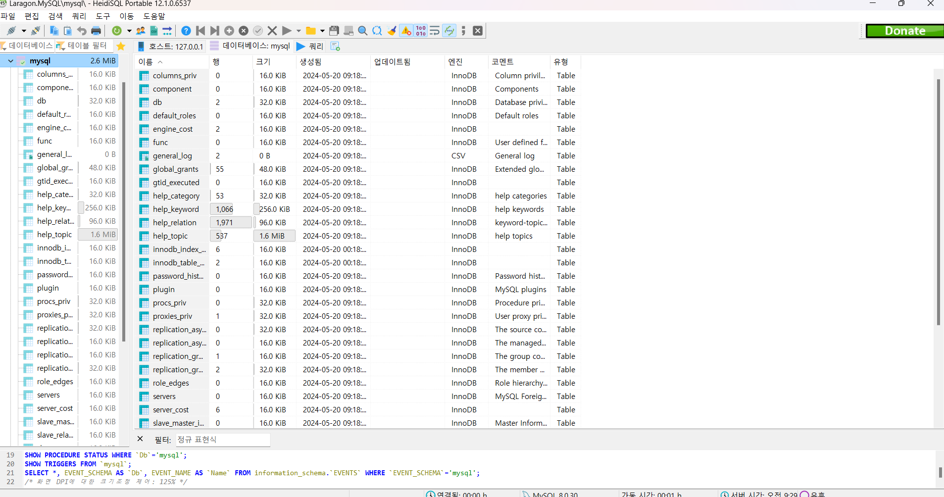database를 누르면 이렇게 눈으로 볼수있다 나는 처음에 root 계정으로 했지만 이후 encore / encore1234에 모든 권한을 줘서 들어왔다.