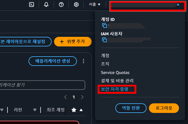 콘솔 홈 오른쪽 상단의 유저 정보를 클릭하고 "보안 자격 증명" 클릭