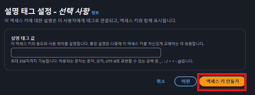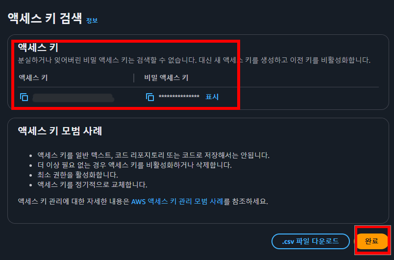 "액세스 키", "비밀 액세스 키"를 안전한 곳에 기록해둔다.