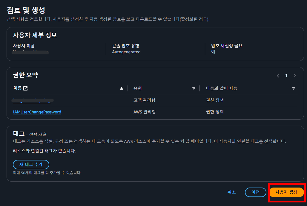 검토 및 생성 에서 정보 확인 후, 사용자 생성 클릭