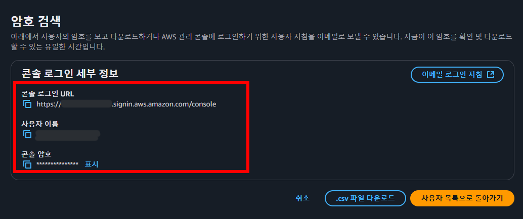IAM 사용자 세부정보( 콘솔 로그인 URL과 사용자 이름, 콘솔 암호)를 잘 기록해둔다.