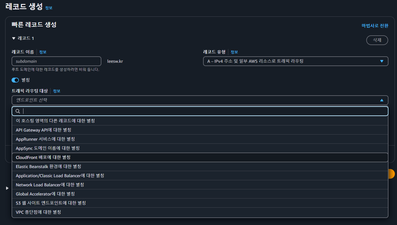Route53 Alias 레코드 생성 Route53 해당 호스팅으로 들어간다. 레코드 생성 클릭 별칭(Alias) 체크 후, CloudFront 배포에 대한 별칭 설정