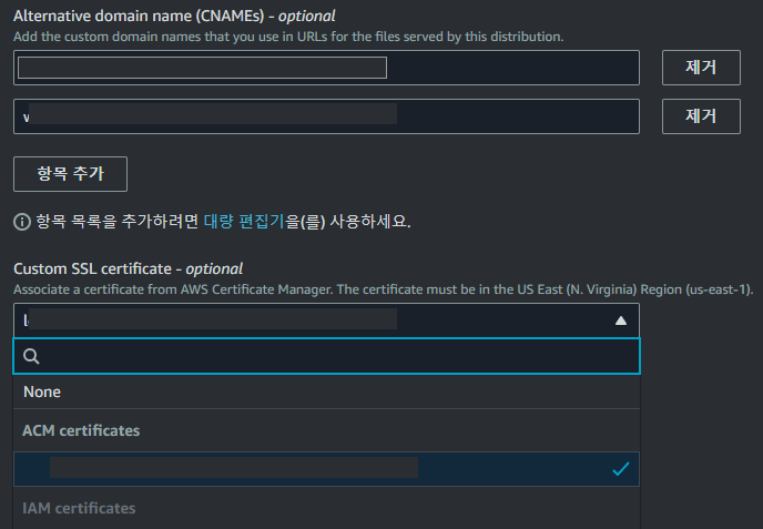 ACM 인증서 연결 Custom SSL certificate에 ACM 인증서를 클릭해준다.