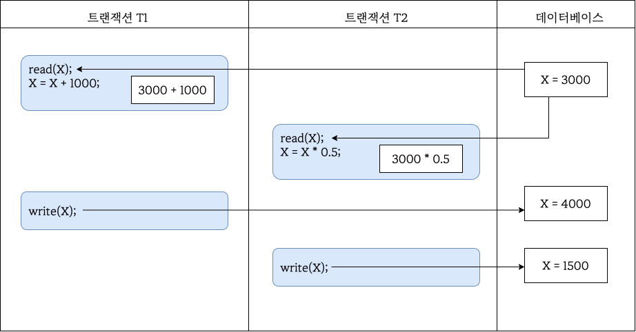 하나의 트랜잭션이 수행한 데이터 변경 연산의 결과를 다른 트랜잭션이 덮어써 변경 연산이 무효화 되는 것