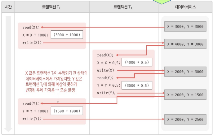 하나의 트랜잭션이 여러 개의 데이터 변경 연산을 실행할 때 일관성 없는 상태의 데이터베이스에서 데이터를 가져와 연산을 실행함으로써 모순된 결과가 발생
