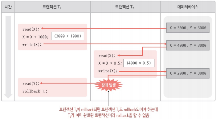 트랜잭션이 완료되기 전 장애가 발생하여 rollback 연산을 수행하면, 장애 발생 전에 이 트랜잭션이 변경한 데이터를 가져가서 변경 연산을 실행한 다른 트랜잭션에도 rollback 연산을 연쇄적으로 실행해야 한다는 것