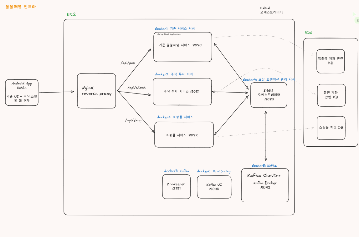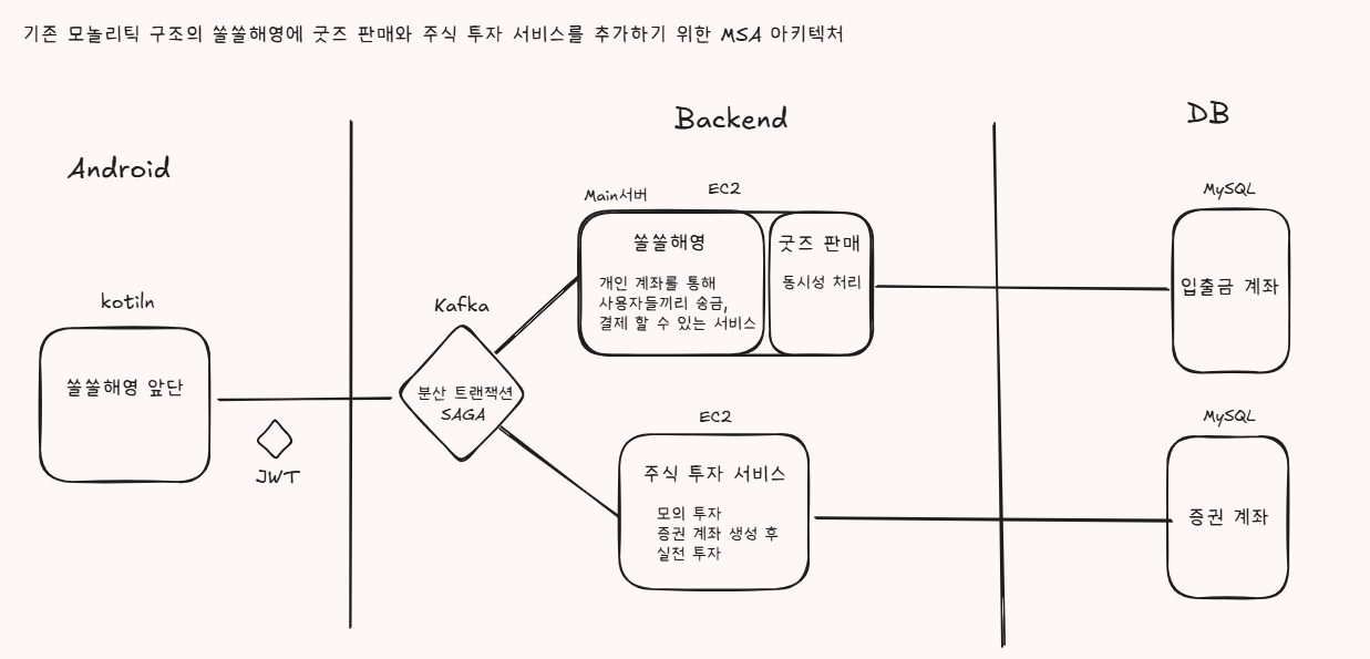 기존 쏠쏠해영의 입출금 계좌 서비스와 증권 계좌 서비스를 분리하여 MSA 아키텍처를 구상했습니다.
