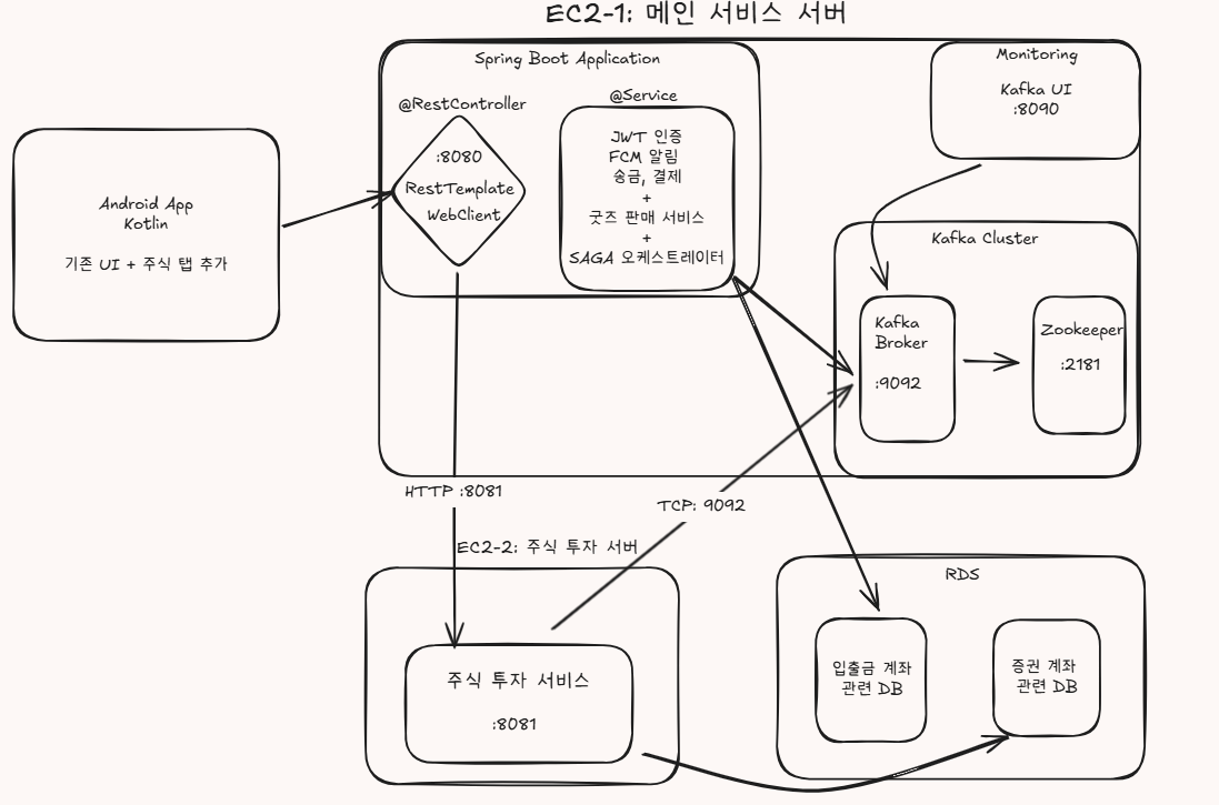 Kafka Cluster도 EC2-1 에 배포하여 두 서비스에서 에러가 발생했을 때 보상 거래를 담을 수 있도록 설계하였고 이 그림을 통해 컨설턴트님에게 피드백을 받았습니다.