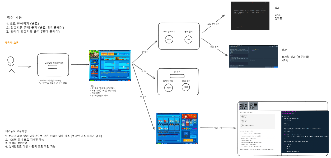 https://garticphone.com/ko 처럼 알고리즘 문제를 하나의 에디터에서 돌아가면서 풀고 협력해서 문제를 해결할 수 있는 게임이다.
