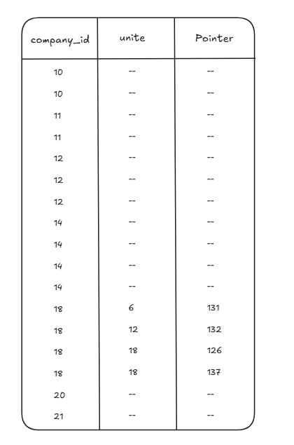 이렇게 생성이 되고 company_id 를 우선적으로 정렬 그리고 18이 같은 경우 units를 정렬하여 생성이 된다. 그렇게 company_id 와 units를 빠르게 찾아서 값을 반환할 수 있다.