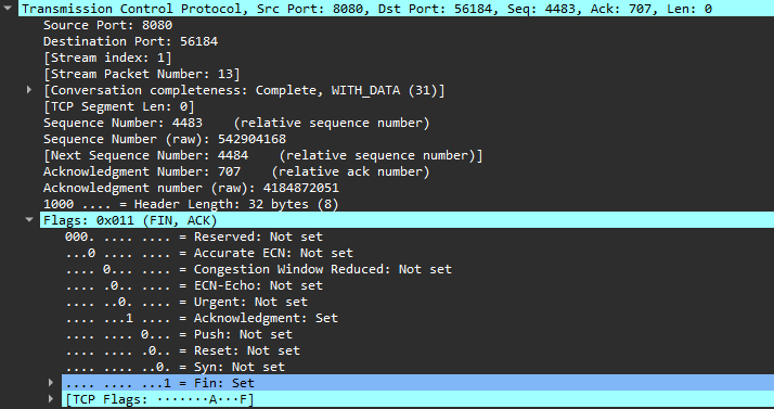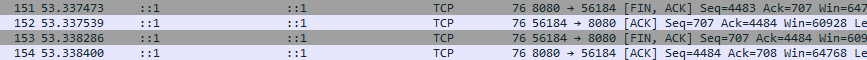 FIN, AKC -> ACK 과 FIN, ACK -> ACK 과정을 확인할 수 있다.