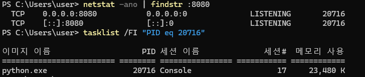 netstat -ano 를 사용하면 (관리자 권한) 프로세스 ID를 포함해서 볼 수 있는데 이걸로 어떤 프로세스인지 확인이 가능하다.