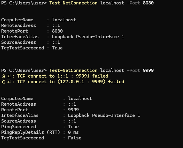 8080은 TCP 연결이 되는 모습 (9999는 실패..)
